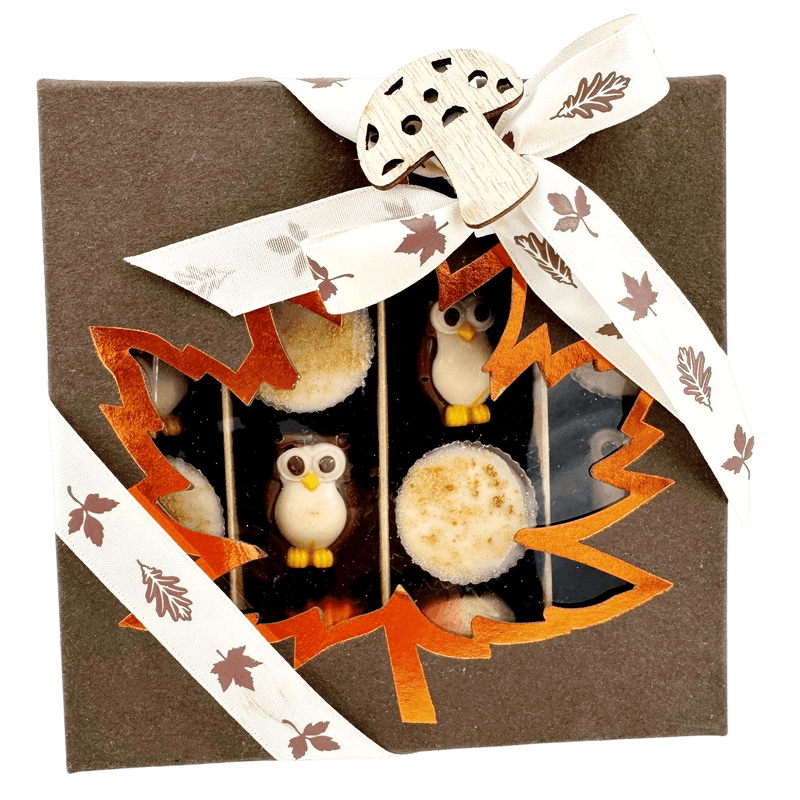 Scoprite la nostra scatola autunnale di praline al cioccolato, 16 cioccolatini belgi fatti a mano in un'elegante confezione regalo marrone scuro. Perfetta per un regalo stagionale o per concedersi un momento di relax