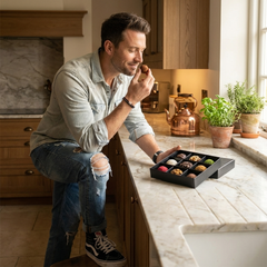 Concedetevi una pura eleganza con la nostra scatola Tentazione nera , 9 squisiti tartufi di cioccolato belga (135 g) lavorati a mano dalla fava alla tavoletta. Una lussuosa miscela di intensità scura e cremosa indulgenza, perfetta per un regalo o un piacere personale. 🍫✨