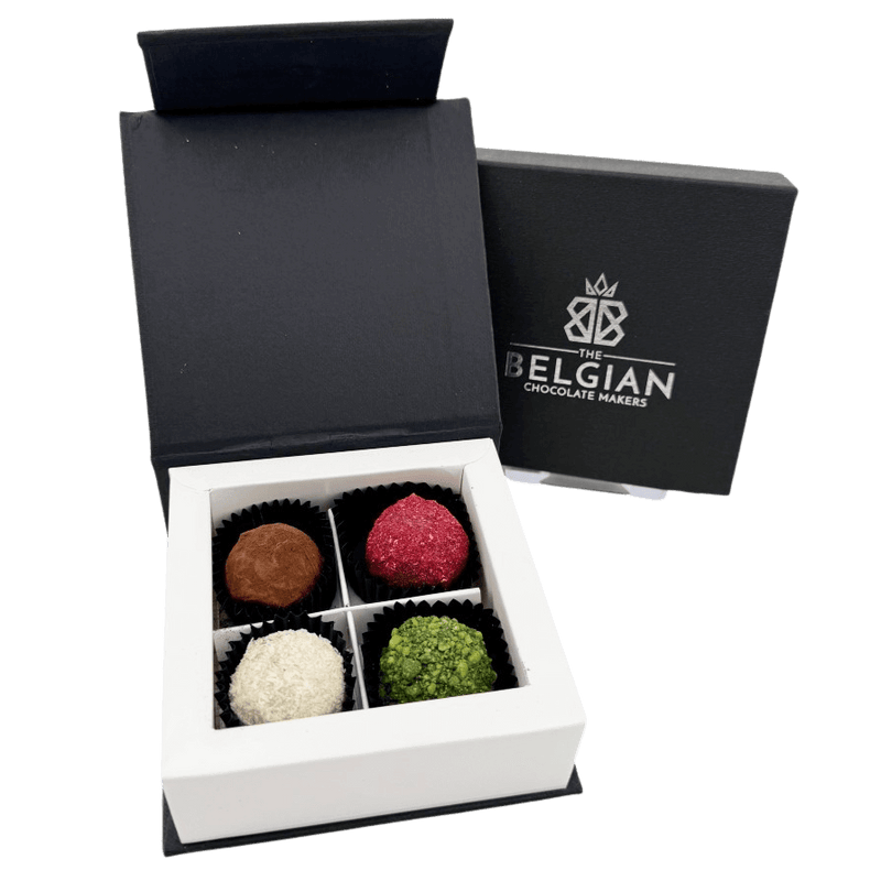 Concedetevi la nostra scatola di 4 tartufi di cioccolato belga in gusti misti, prodotti a Bruxelles con cacao etico. Un regalo raffinato o una delizia gastronomica da condividere.