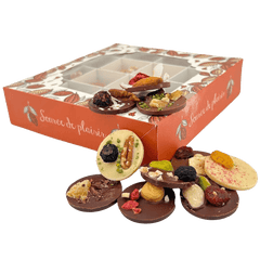 Godetevi la nostra scatola di 48 mendiants al cioccolato belga, prodotti a mano a Bruxelles con cacao etico e guarnizioni gourmet. Un regalo raffinato o una delizia indulgente