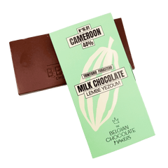 Il cioccolato al latte Lembé Yézoum 44% del Camerun, un'esclusiva tavoletta monorigine prodotta artigianalmente a Bruxelles. Una creazione da 100 g con note raffinate e un terroir eccezionale