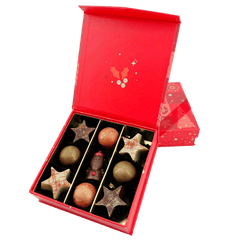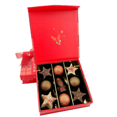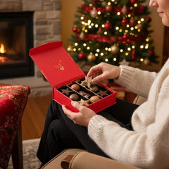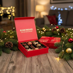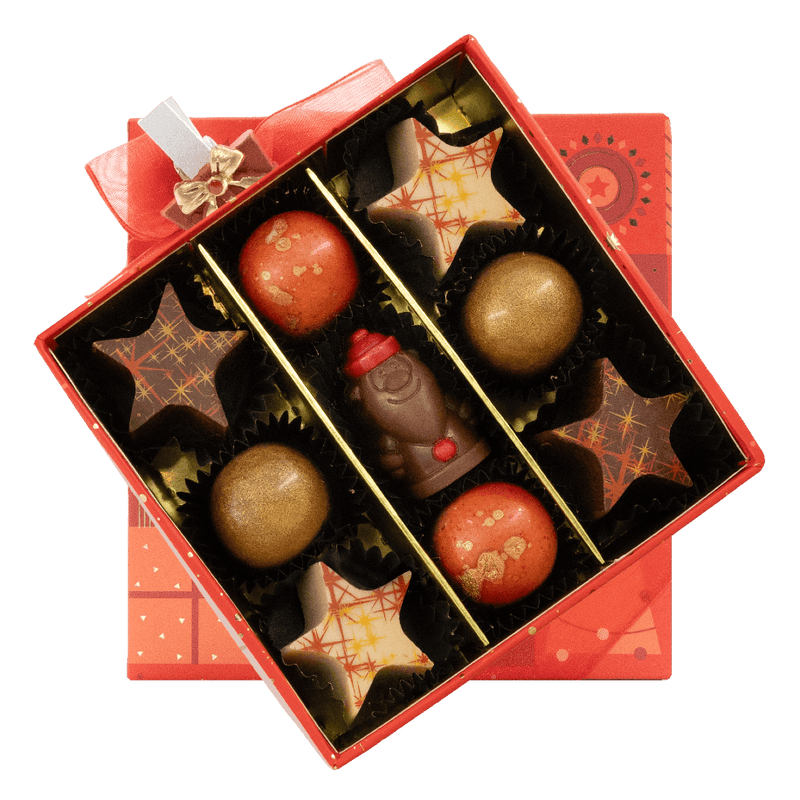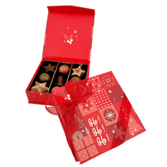 Condividete la gioia del Natale con la nostra scatola di cioccolata Ho-Ho-Ho, riempita con 9 praline belghe artigianali (135 g). Un assortimento festoso realizzato con cacao etico e passione artigianale a Bruxelles.