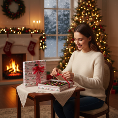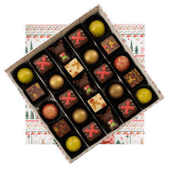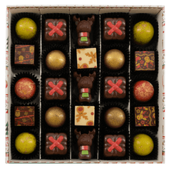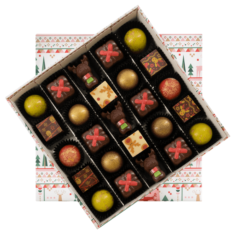 Entrate nella magia della nostra scatola natalizia con 25 praline belghe artigianali (375 g). Una selezione festosa ed elegante di creazioni in grani, perfette per essere regalate e per celebrare la stagione nel vero stile del cioccolato belga. ☃️