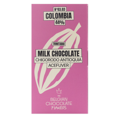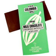 Colombia Chigorodó Antioquia Acefuver 44% di cioccolato al latte, prodotto artigianalmente a Bruxelles con cacao monorigine. Una tavoletta morbida con delicate note fruttate e di caramello