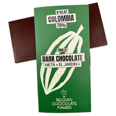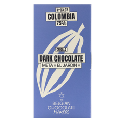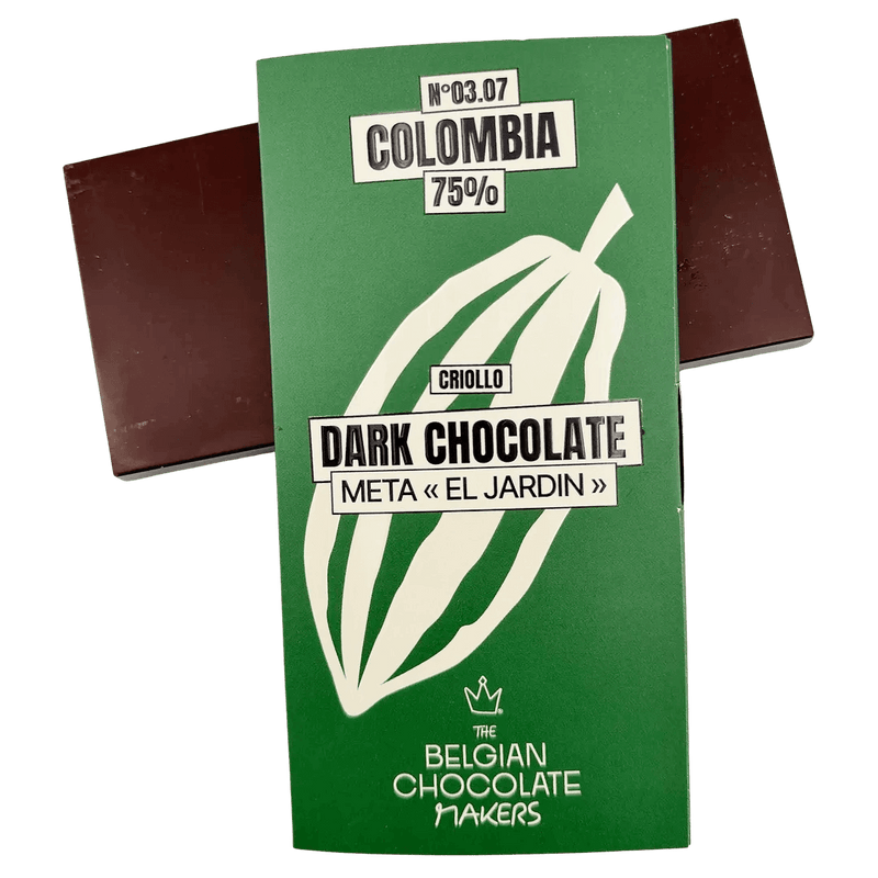 Colombia Meta El Jardín 75%, un'esclusiva tavoletta monorigine prodotta artigianalmente a Bruxelles. Raro cacao Criollo che offre una raffinata eleganza fruttata e un terroir eccezionale