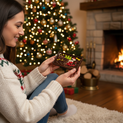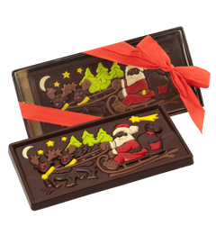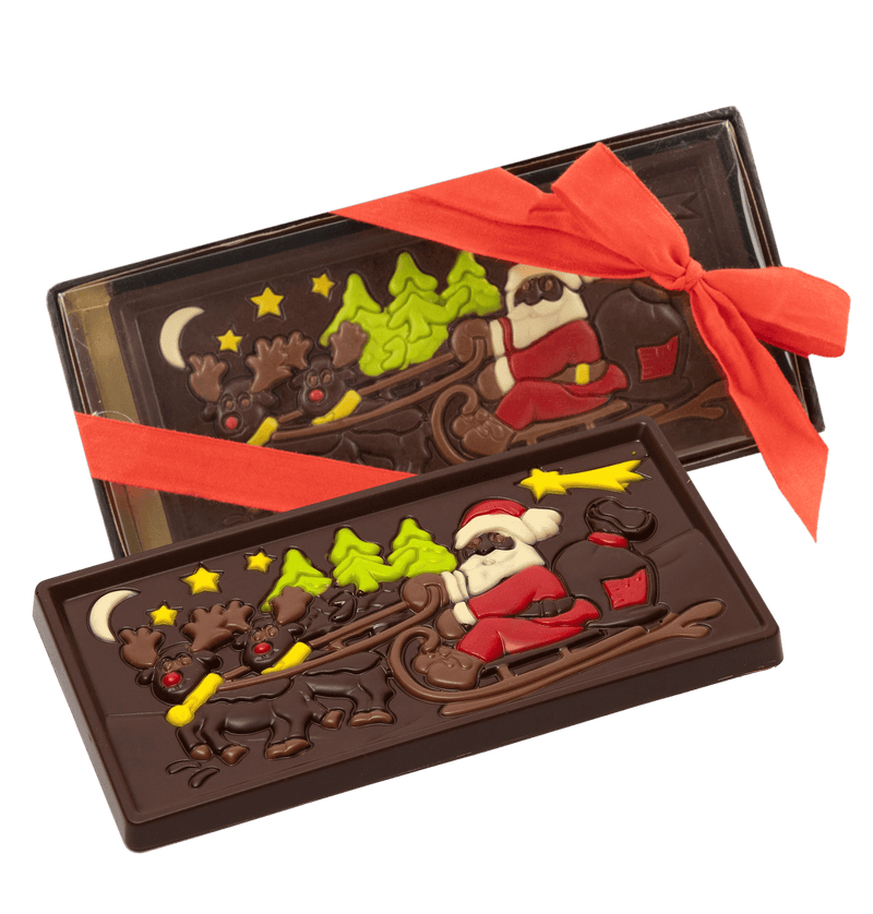 Godetevi la magia del Natale con la nostra tavoletta di cioccolato fondente Babbo Natale in slitta. Prodotta a mano in Belgio con cacao di origine pura, per una delizia golosa e festosa