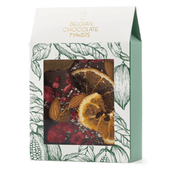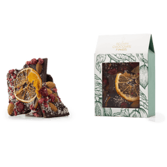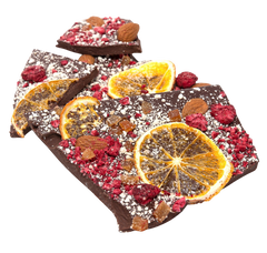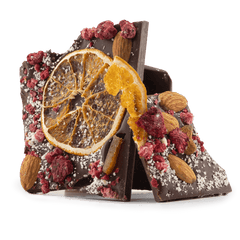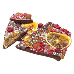 Tavolette spezzate di cioccolato fondente con lamponi, mandorle e arancia