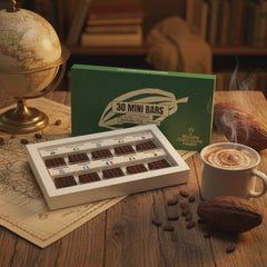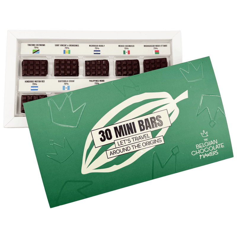 Esplorate la nostra scatola di cioccolato belga con 30 mini tavolette all'interno di 10 diversi cacao monorigine. Assaggiate 10 cacao monorigine, sapori artigianali e creazioni gourmet, un regalo perfetto o un'occasione da non perdere