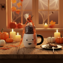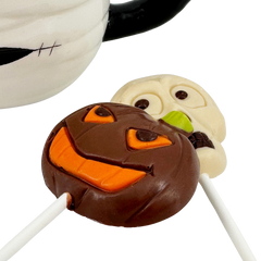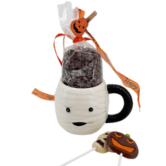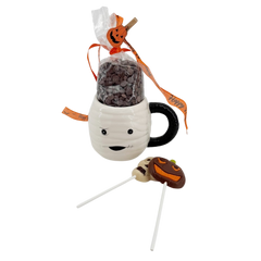 Spaventoso e delizioso! La nostra tazza a tema mummia è riempita con cremose gocce di cioccolato fondente belga e divertenti lecca-lecca. Un regalo di Halloween perfetto per i bambini e gli amanti del cioccolato