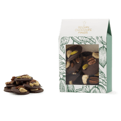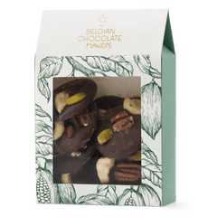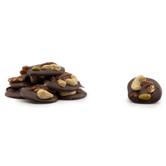Deliziosi mendiants al cioccolato fondente da 150 g con pezzetti di anacardi, pistacchi, uvetta e noci pecan, una miscela perfetta di cacao e croccantezza