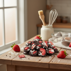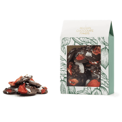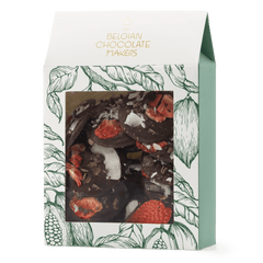 Deliziosi mendiants al cioccolato fondente da 150 g, conditi con cacao, fragole e pezzi di cocco, un mix perfetto di cacao e croccantezza