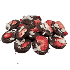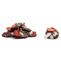 Mendiants al cioccolato fondente con cacao nibs, fragola e pezzi di cocco