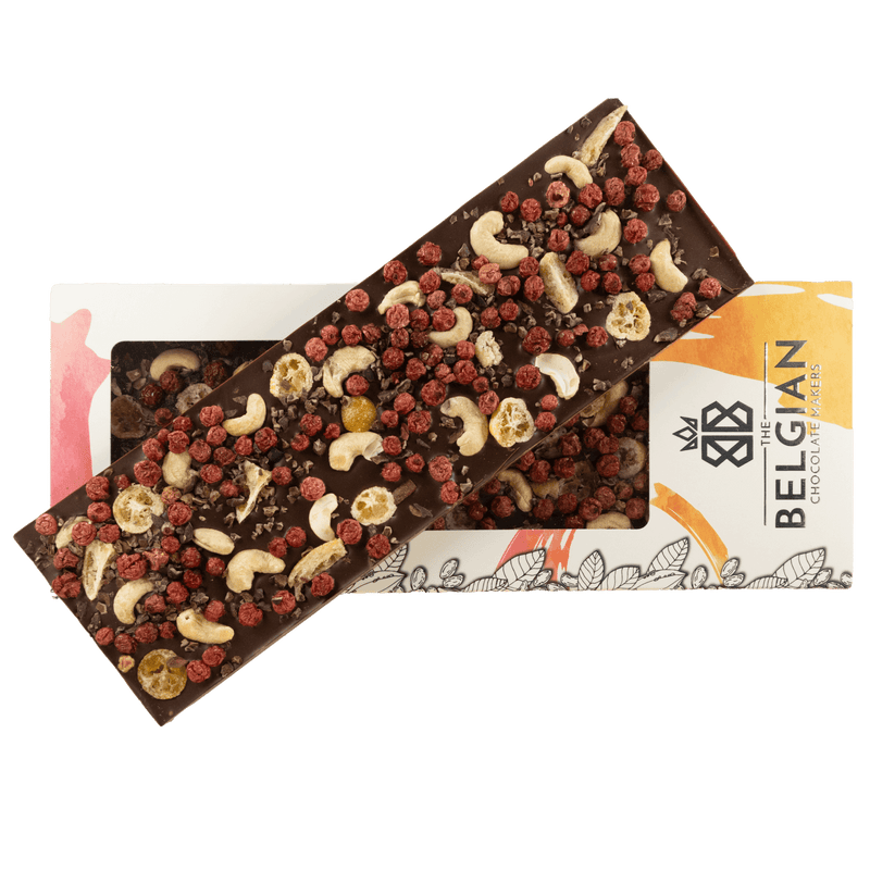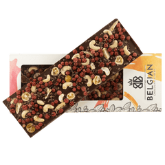 Scoprite la nostra tavoletta di cioccolato fondente Fantasy da 550 g, realizzata con cacao, anacardi, kumquat e pezzi di ribes rosso. Una delizia belga oversize, perfetta per essere regalata o condivisa.