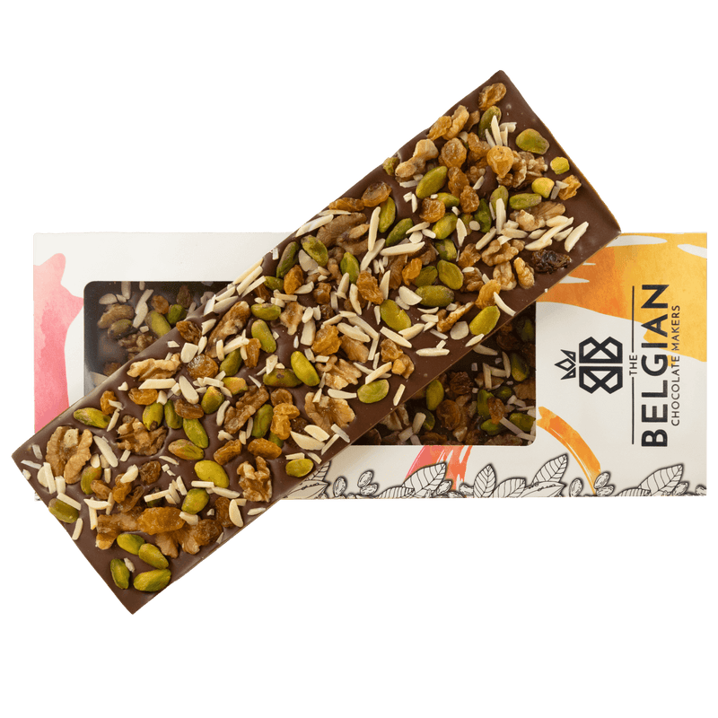 Assaporate la nostra tavoletta di cioccolato al latte Fantasy da 550 g, realizzata con noci, pistacchi, mandorle e uvetta. Una creazione belga sovradimensionata e indulgente, ideale per essere regalata o condivisa