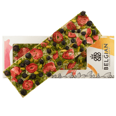 Concedetevi la nostra tavoletta di cioccolato bianco Fantasy da 550 g, lavorata a mano con croccanti pistacchi, dolci fragole e pezzetti di mirtillo. Una delizia golosa di dimensioni eccessive, perfetta da condividere o regalare.