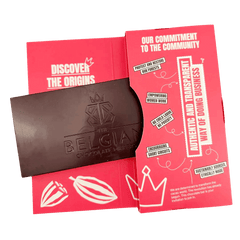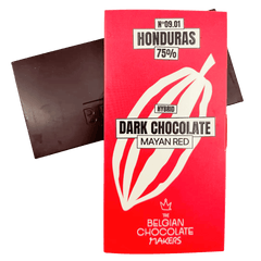 Cioccolato fondente Honduras Mayan Red 75%, prodotto artigianalmente a Bruxelles con cacao monorigine. Una tavoletta rara con ricche note di frutta rossa e una raffinata complessità.