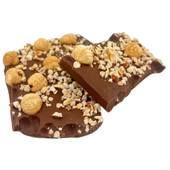 Tavolette spezzate di cioccolato al latte con nocciole, prodotte artigianalmente. Prodotte con cacao pregiato proveniente da Haiti, offrono una delizia da intenditori morbida, fruttata e con nocciole