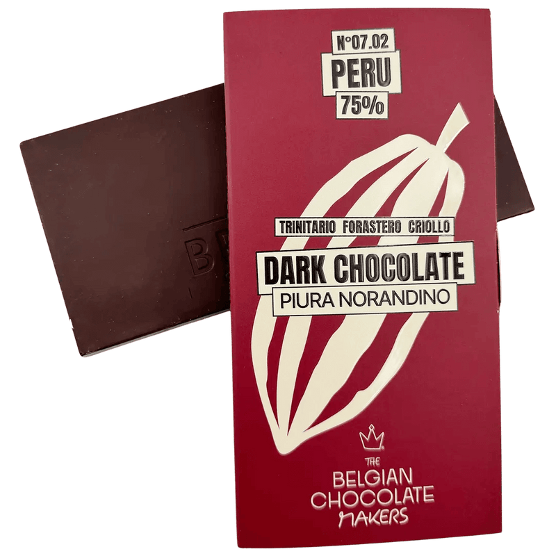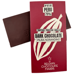 Cioccolato fondente Perù Piura Norandino 75%, prodotto artigianalmente a Bruxelles con cacao monorigine. Una tavoletta rara, dalle delicate note fruttate e dalla raffinata eleganza