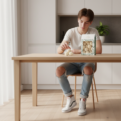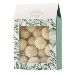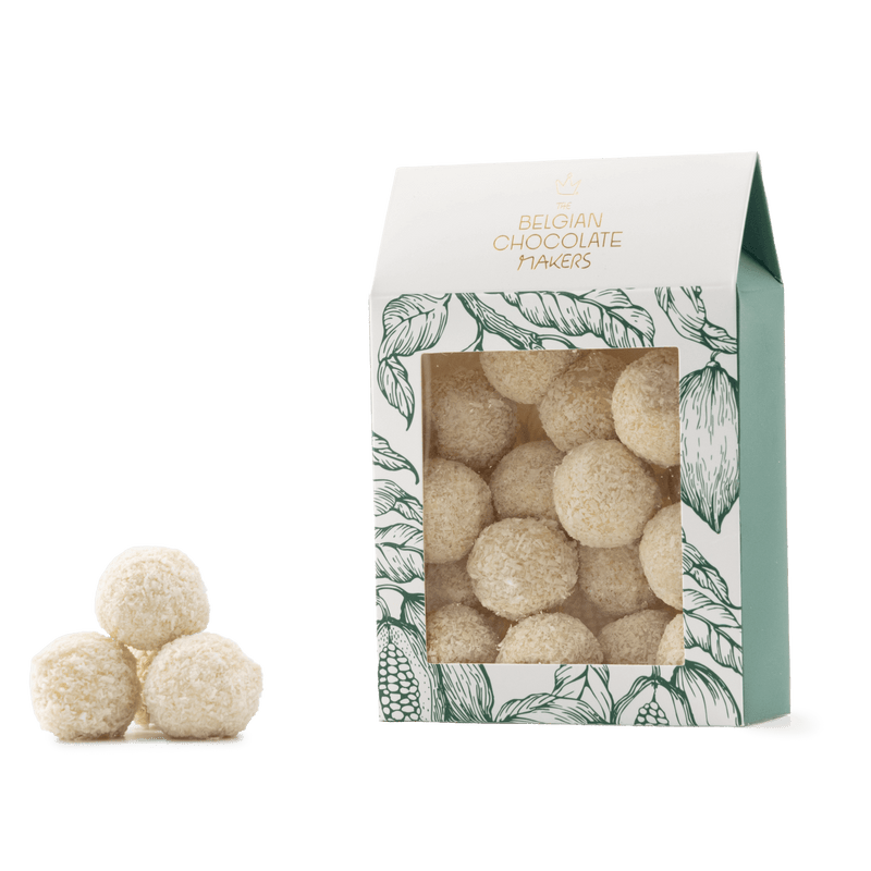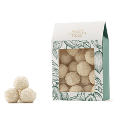 Godetevi la nostra confezione da 160 g di tartufi al cioccolato belga con cocco. Prodotti artigianalmente a Bruxelles, sposano il ricco cacao con le esotiche scaglie di cocco per una raffinata delizia da gourmet.