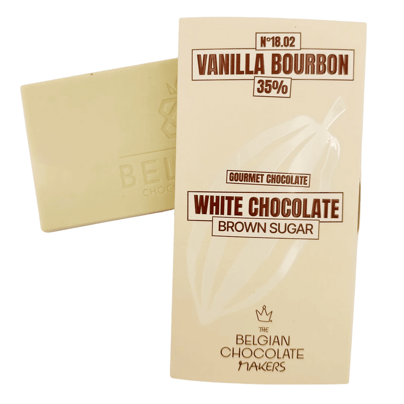 Tavoletta di cioccolato bianco artigianale con vaniglia Bourbon 35%, prodotta a Bruxelles. Una creazione da 100 g che unisce dolcezza e raffinata eleganza gastronomica